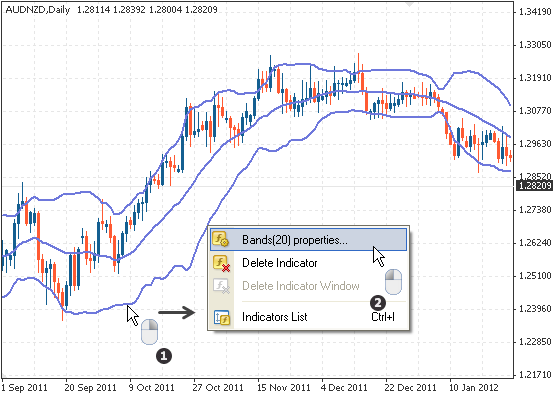 В терминале МТ4 изменения вносятся тоже очень просто, достаточно выбрать индикатор и зайти в его свойства: