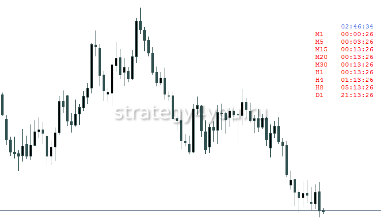 Этот таймер может работать на любых биржевых интервалах (от M1 до D1), показывая серверное время и то, которое осталось до окончания текущей свечи.