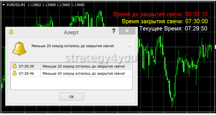 Функциональный и легкий в настройках индикатор Closetime присылает трейдерам сигналы по почте, посредством push-уведомлений или алертов, когда до финала остается менее 20 секунд.