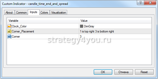 Этот свечной таймер для МТ5 оповещает о том, сколько минут или секунд осталось до полного закрытия текущей свечи. Биржевой игрок может самостоятельно настроить: