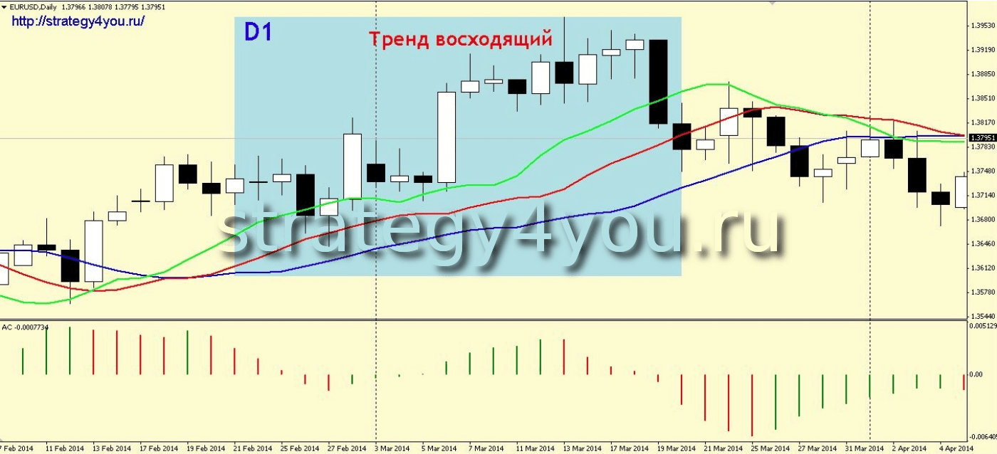 Инструмент является сложной профессиональной торговой системой, однако его сочетание с другими индикаторами повышает результативность торговых сделок на рынке. Интерес представляет пара: AC и индикатор «Аллигатор», как пользоваться ими на трех таймфреймах: на интервалах D1 + H4 + H1 инструмент АС устанавливают только на D1 и H1, Alligator — на 3 таймфрейма.