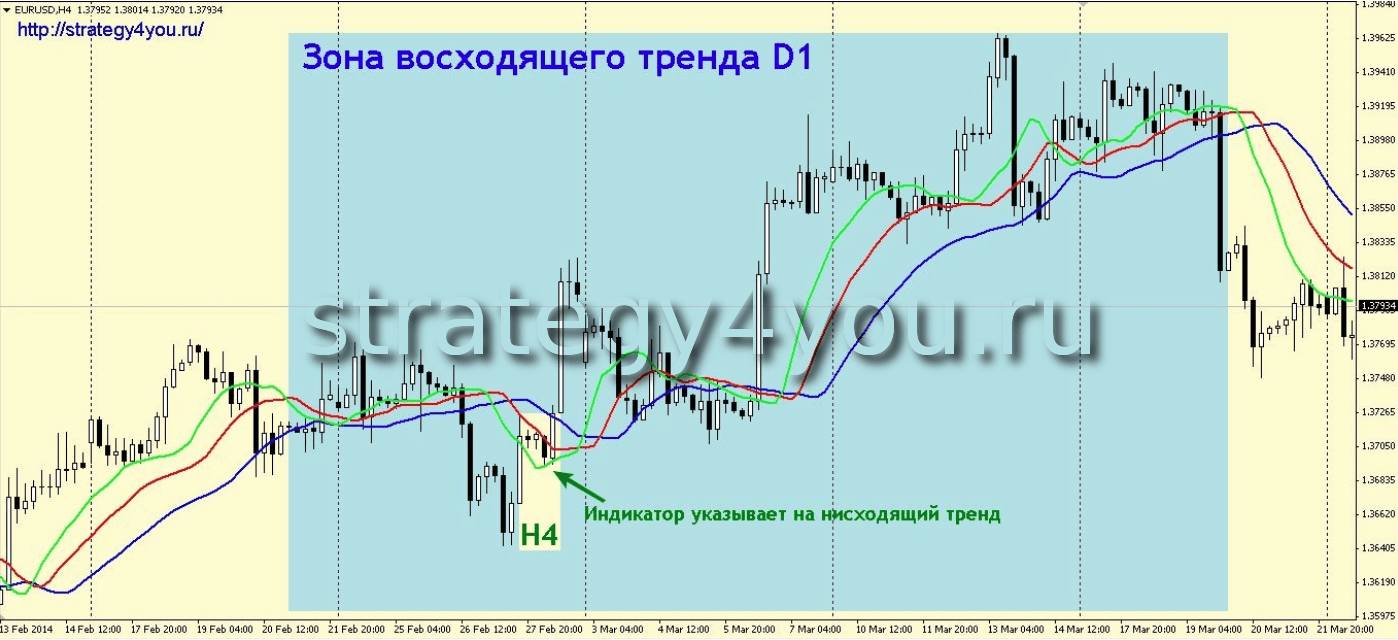 Тренд восходящий при расширяющихся линиях под свечами. Он становится нисходящим при их сужении и пересечении друг другом с переходом в положение над свечами. Эти трендовые движения являются сигналами к покупке или продаже.