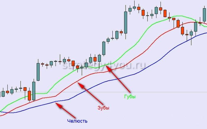 У «Аллигатора» она усугублена сдвигом линий на разные дистанции. Недостаток запаздывания сигналов приводит к тому, что в 50-70% случаев они появляются, когда цена уже прошла большую дистанцию в трендовом направлении. В этом случае открытие позиции грозит попаданием на окончание тренда.