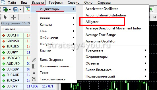 Базовый инструмент встроен в торговый терминал MetaTrader 4. Его можно найти и в другом аналогичном программном обеспечении. Для того чтобы вывести индикатор Alligator на график в MT4, нужно выполнить несколько действий: