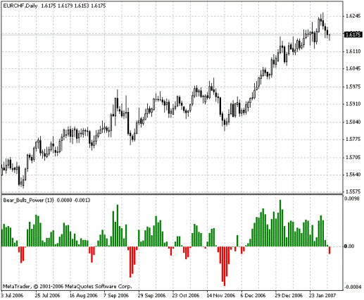 По своей сути индикатор силы быков является осциллятором. Его применяют к графику котировок той или иной валютной пары. Когда на рынке наблюдается восходящий тренд, то максимальная сила получается выше экспоненциальной 13-периодной скользящей средней, и сила быков должна быть больше нуля, а гистограмма индикатора расположена выше нулевой линии. Когда же максимальная цена опускается ниже экспоненциальной 13-периодной скользящей средней, то значения гистограммы ниже нуля, так как сила быков становится отрицательной.