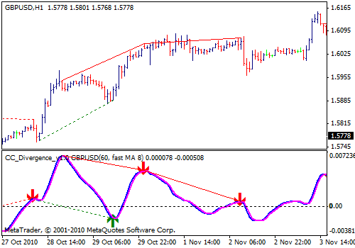 И быстрая, и медленная кривые учитываются при определении дивергенций. Этот индикатор более гибкий по сравнению с предыдущим, но регистрирует большое количество незначительных сигналов (т. е. «рыночный шум»). Его достоинство — относительно небольшое запаздывание.
