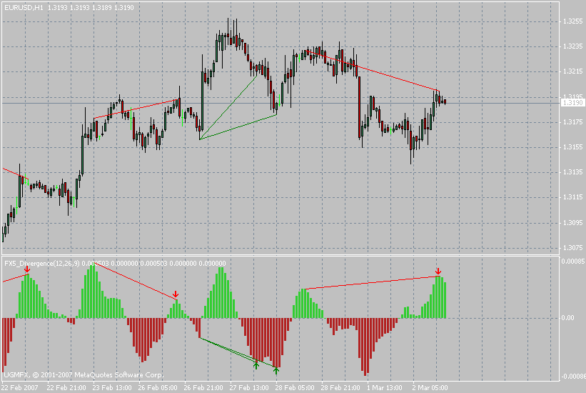 В индикаторе FX5_Divergence оптимальные точки входа рисуются на графике стрелками. Дивергенция также отображается графически. В этой модификации MACD характерная для предшественника проблема запаздывания практически полностью решена. Уменьшен объем поступающего «рыночного шума» и отфильтрованы ложные сигналы.