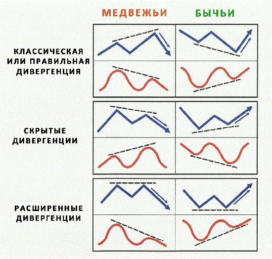 Формируется дивергенция по одному из трех типов: скрытая, явная или расширенная.