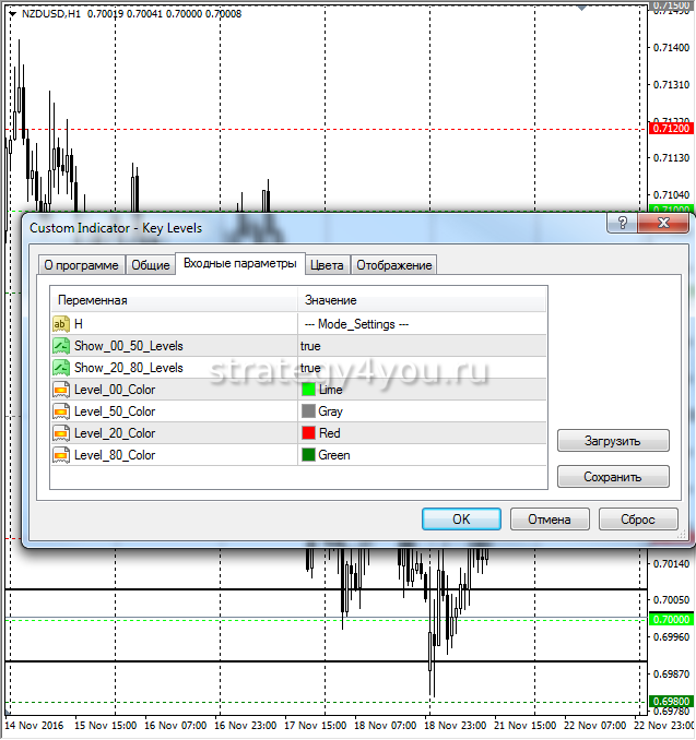 Для облегчения задачи учета ключевых ценовых уровней используют Key Levels. Этот инструмент устанавливают по стандартной инструкции. Он служит для отображения ценовых линий 00, 50, 20 и 80. Для этого используют линии разных цветов. В настройках индикатора можно включить или выключить показ уровней 00 и 50, 20 и 80, настроить их цвета при индикации на графике.