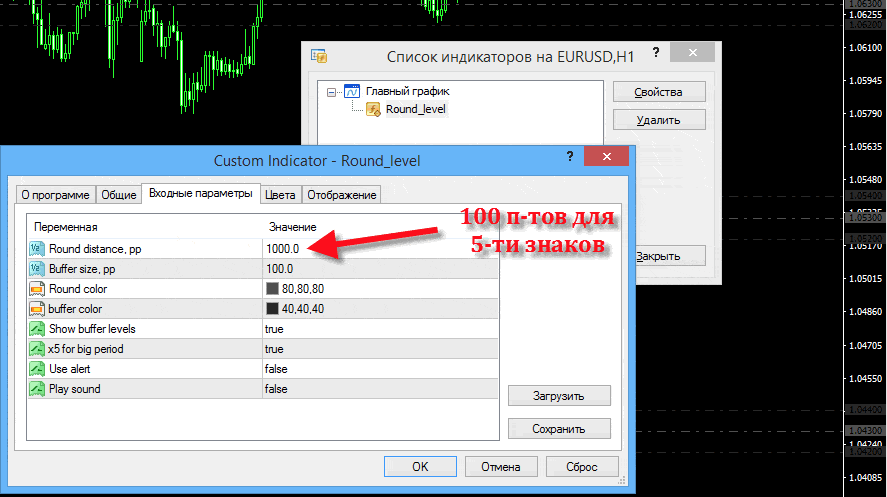 Индикатор Round Level производит построение линии 1 раз при переносе его на график или изменении параметров. В отличие от других инструментов для индикации, он не оставляет после себя большого числа следов (удаляет их за собой). График имеет аккуратный вид. При удалении индикатора с рисунка исчезают и следы. Он имеет такую функцию, как звуковой алерт. Она используется при невозможности постоянного мониторинга графика. Звук раздается, когда цена достигает линии.