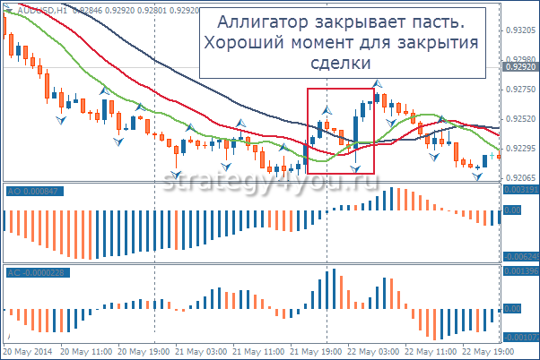 - Закрытие позиции по-обратному Fractals, АО или МАСД.
