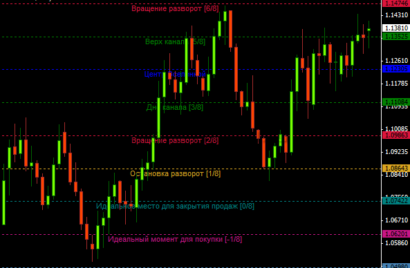 Нанося линии Мюррея на график, трейдер определяет главные разворотные уровни 0/8 и 8/8, потом делит пространство между ними на восемь одинаковых частей. Таким образом, удается получить 9 горизонтально расположенных линий, которые разделяют ценовой коридор на одинаковые части, давая основу для анализа.