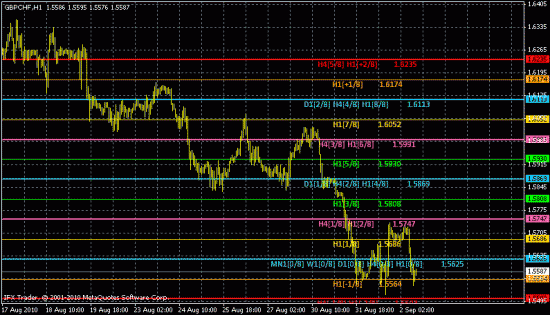 Все пространство на ценовом графике от минимума до максимума стоимости по горизонтали делится на ценовые секторы с разбивкой по 1/8. Также график разбивается и на вертикальные временные секторы. В случае перехода с меньшего ТФ на больший будут отображены линии с иными значениями, что подтверждает фрактальную закономерность построения и правильность выбранного автором подхода к торговле.