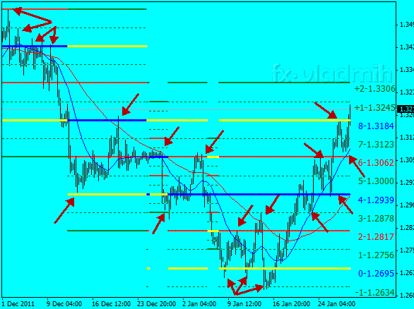 - +1/8 и -1/8 – сопротивление и поддержка, вероятность, что цена при подходе к ним пойдет в противоположную текущему тренду сторону.