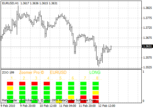 4) Zoomer Pro – продолжает идеи Элдера, при формировании сигнала ориентируется на разные ТФ. Использует алгоритмы анализа, базирующиеся на методах построения скользящих средних, зон Ишимоку, полос Фибоначчи.