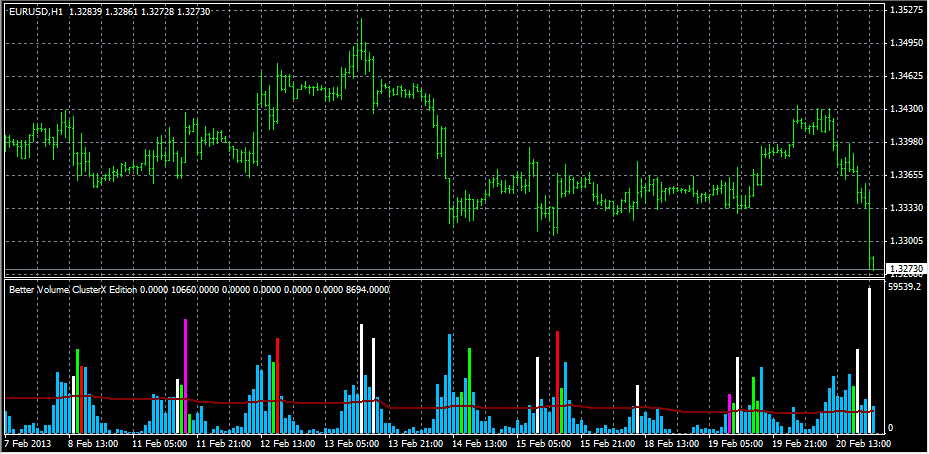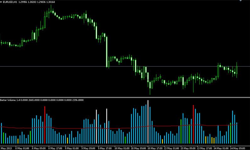 1) Одним из наиболее популярных считается Better Volume (скачать можно по ссылке выше), который наглядно отображает ситуацию, окрашивая столбцы в разные цвета. Трейдер может видеть, какие действия совершают маркет-мейкеры и следовать за ними. Для проведения анализа сравнивают тиковый объем и диапазон текущей свечи на ценовом графике, руководствуясь общими правилами анализа данных показателей.