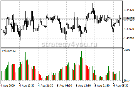 Такой индикатор относительного объема для МТ4 можно найти в стандартном пакете торгового терминала по адресу «Вставка/Индикаторы/Объемы/ Volumes».
