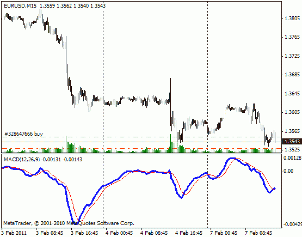 Если желтая линия идет снизу вверх, достигая красной, а в гистограмме преобладает красный цвет, это свидетельствует о благоприятном моменте для входа на рынок и начала продаж. Если красная линия спускается сверху, пересекая желтую, а гистограмма зеленая, это выгодная точка для входа и осуществления покупок.