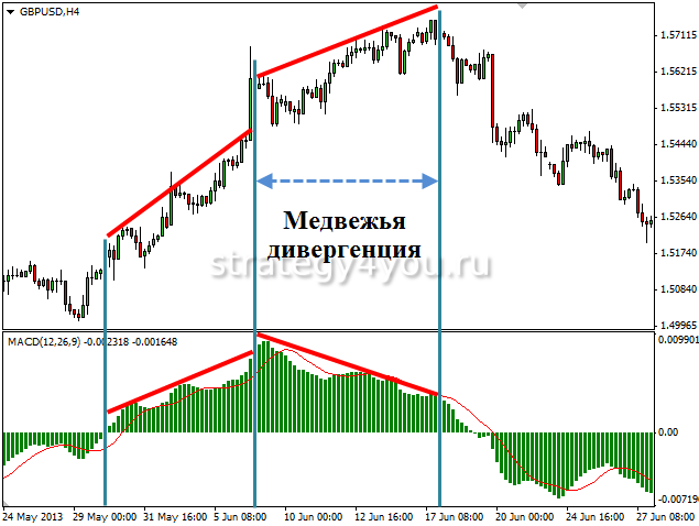 Когда ценовая динамика формирует верхние максимумы, а гистограмма — нижние, присутствует бычья дивергенция. Когда ценовая динамика достигает нижних минимумов, а гистограмма — нижних максимумов, это медвежья дивергенция, определяющая восходящий тренд.