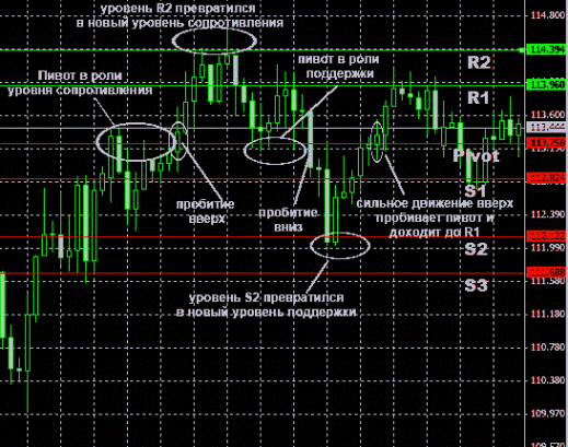 Чтобы поиск и построение PP и уровней были полностью автоматическими, можно воспользоваться индикаторами Pivot Points. Преимущество такого способа состоит в том, что трейдеру не придется переходить с одного графика на другой.