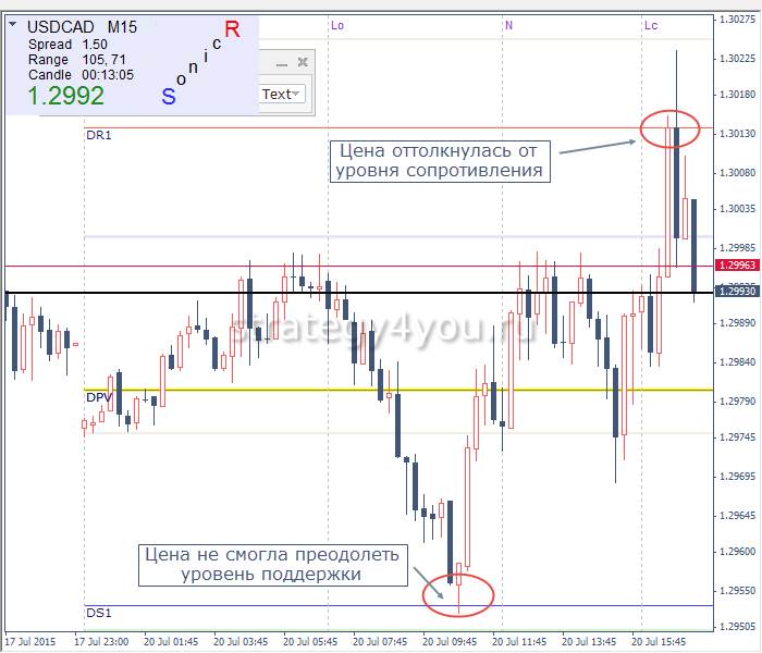 Стратегия с отскоком. После того как были найдены PP и построены уровни, дожидаются, чтобы цена подошла близко к границе обозначенного коридора. Чтобы можно было применить стратегию на отскок, цена должна коснуться уровня и начать двигаться обратно. Подходит также ситуация с ложным пробоем.