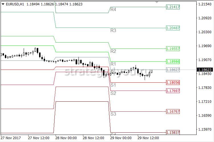 Основой данного технического инструмента является осевая линия (pivot point). Ее находят по формуле. Помимо нее на график наносят дополнительные линии, выступающие в роли уровней сопротивления и поддержки. Расположение этих линий напрямую зависит от положения экстремумов предыдущей сессии и цены открытия и закрытия.