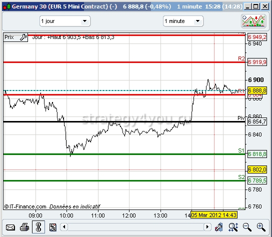Можно воспользоваться методом Тома ДеМарка. Единственное, что стоит принять во внимание — способ позволяет найти не уровни Пивот, а показатели максимума и минимума для указанного периода. В этом случае удается определить осевую линию и 2 уровня.