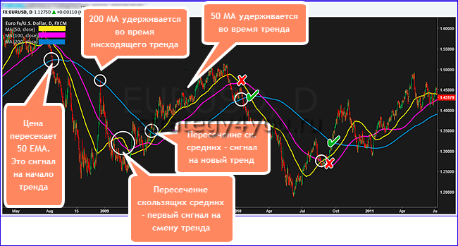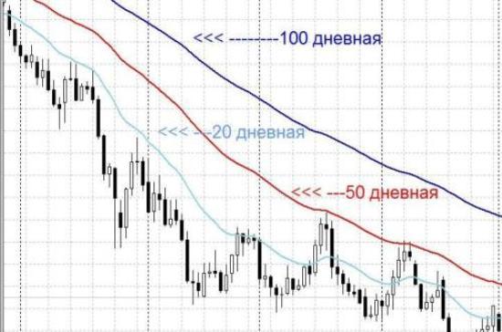 Для того чтобы определить, куда движется тренд, пользуются индикатором simple или exponential. Линия, направленная вверх, и цена, расположенная над ней, свидетельствуют об up-тренде. График стоимости, проходящий под нисходящей скользящей, сообщает о down-тенденции.