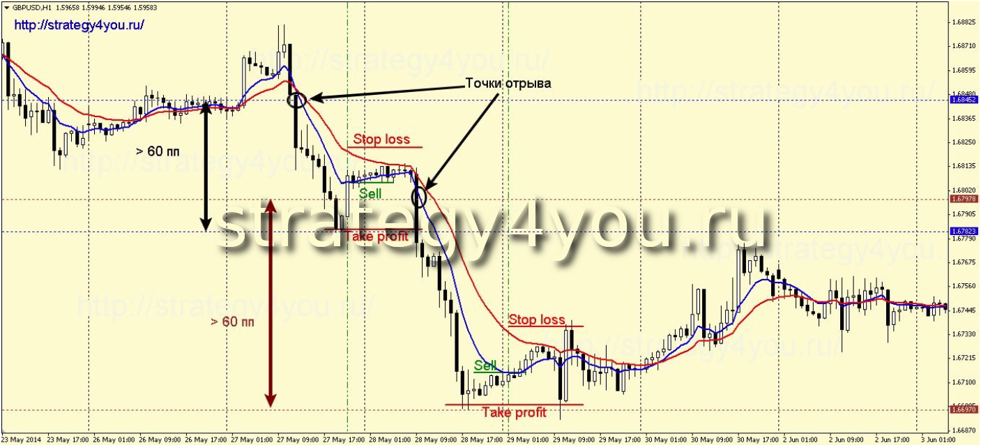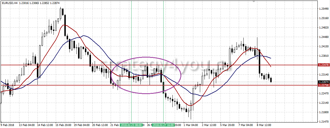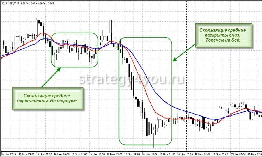 Данная стратегия производит впечатление простой, однако неопытным пользователям следует помнить, что для определения открытия тренда нужно не только выявить пересечение скользящих. Сформировавшаяся картина может свидетельствовать о боковых движениях.