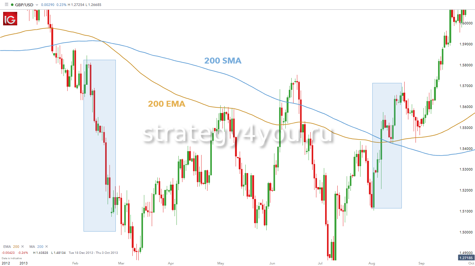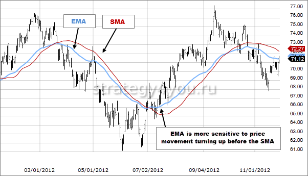 - количество ложных сигналов выше, чем в случае, когда используются простые средние, поскольку данная версия является более чувствительной.