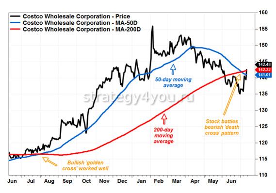 Еще одной из самых популярных является стратегия Golden Cross: MA с периодом 50 и 200. Сигналы покупки и продажи называются золотым крестом и крестом смерти.