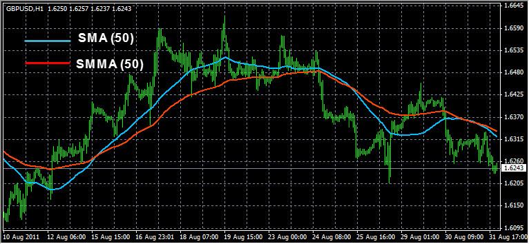 Малое число ложных сигналов и низкая чувствительность отличают сглаженный индикатор ma (Smoothed). Формула ее вычисления сложнее, чем 3 других видов. Используется при сильных колебаниях свечей и не является эффективной для краткосрочных трендов.