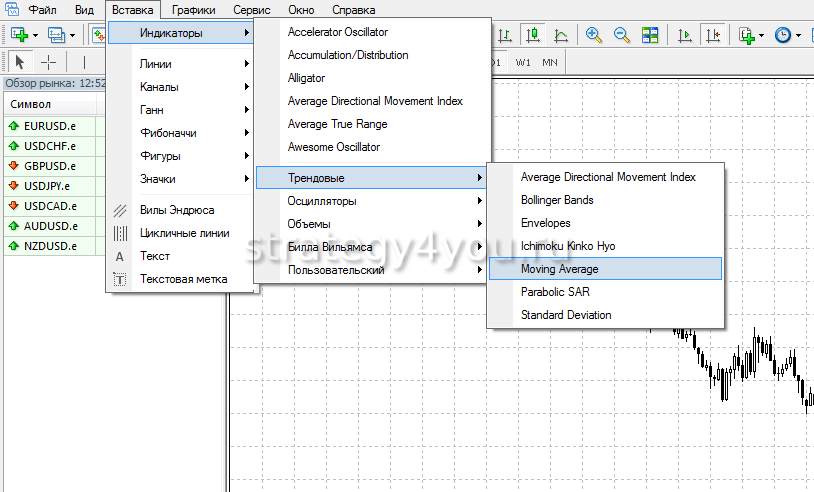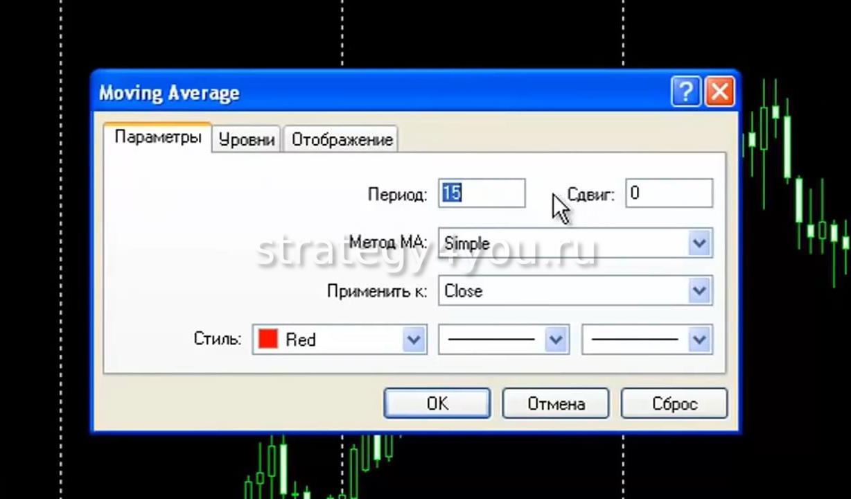 Открыть окно с настройками нужно во вкладке Вставка/Индикаторы/Трендовые/Скользящие средние. Система предложит выбрать период и тип кривой. Есть возможность сместить кривую вправо от ценового графика на установленное клиентом количество свечей.