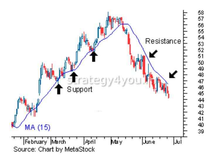 MA позволяет предсказать ценовые поддержки. Для этого ей присваивают круглые значения (50, 100, 200). В месте, где проходит индикатор moving average, в ряде случаев понижение цены замедляется. При применении дополнительных технических определяющих можно добиться отскока от ключевых СС с периодами 50, 200 дней.