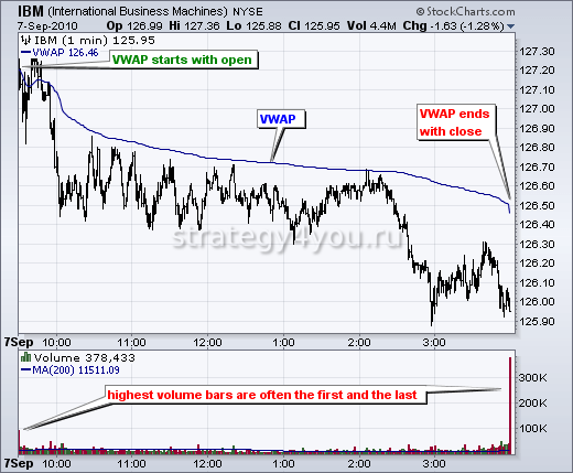 Первая величина, задаваемая при расчете индикатора VWAP на дневном таймфрейме, — цена в начале торгового дня. Сначала показатель будет чутко отслеживать ситуацию на рынке, но ближе к концу дня его точность падает.