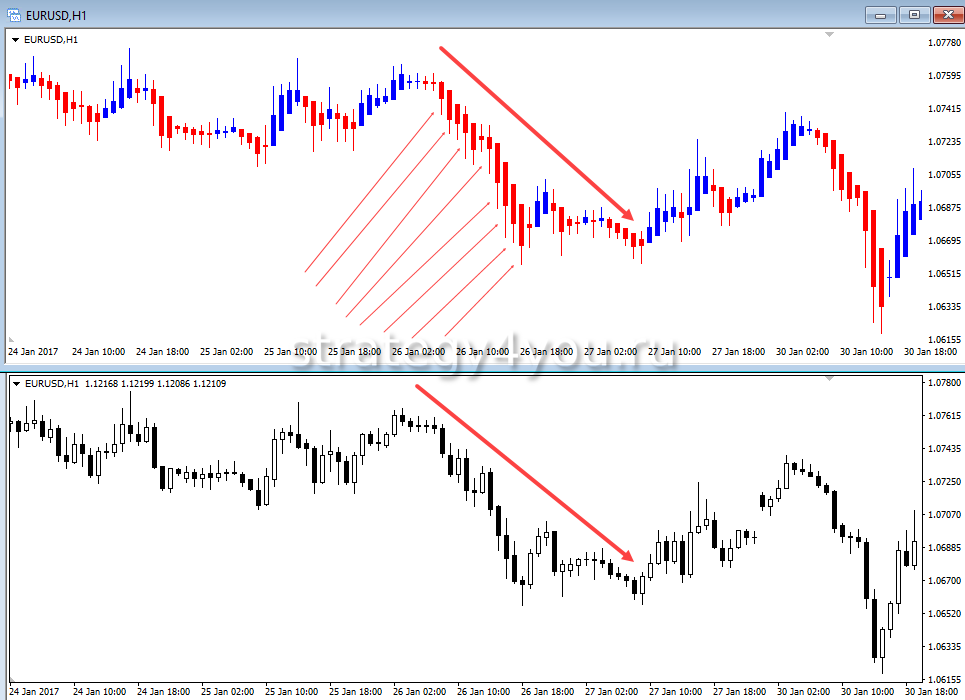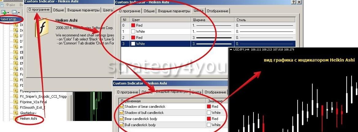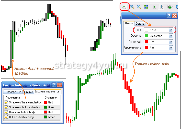 Практически каждая торговая платформа имеет этот инструмент в своем основном комплекте. Настройки терминала позволяют видоизменять вид графика, его цветовую гамму. Платформа MetaTrader 4 также использует свечи Хейкен Аши.