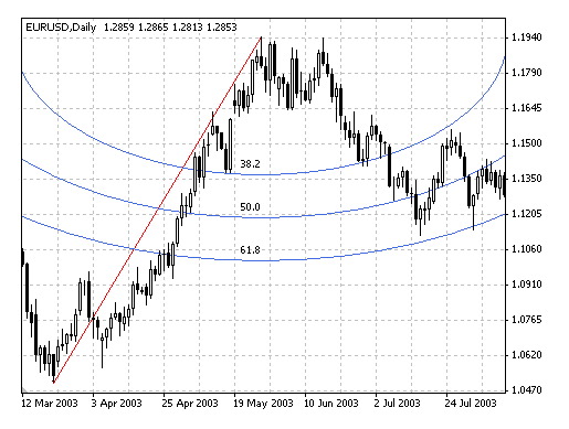 Дуги Фибоначчи в Metatrader 4 отображаются как кривые линии, на графике выступающие в роли потенциальных уровней сопротивления и поддержки. Чтобы построить дуги в торговом терминале, в панели инструментов нужно выбрать вкладку «Вставка/Фибоначчи/Дуги». Потом на графике отмечают две опорные точки на экстремумах стоимости (дно-вершина, дно-дно, вершина-вершина и вершина-дно).