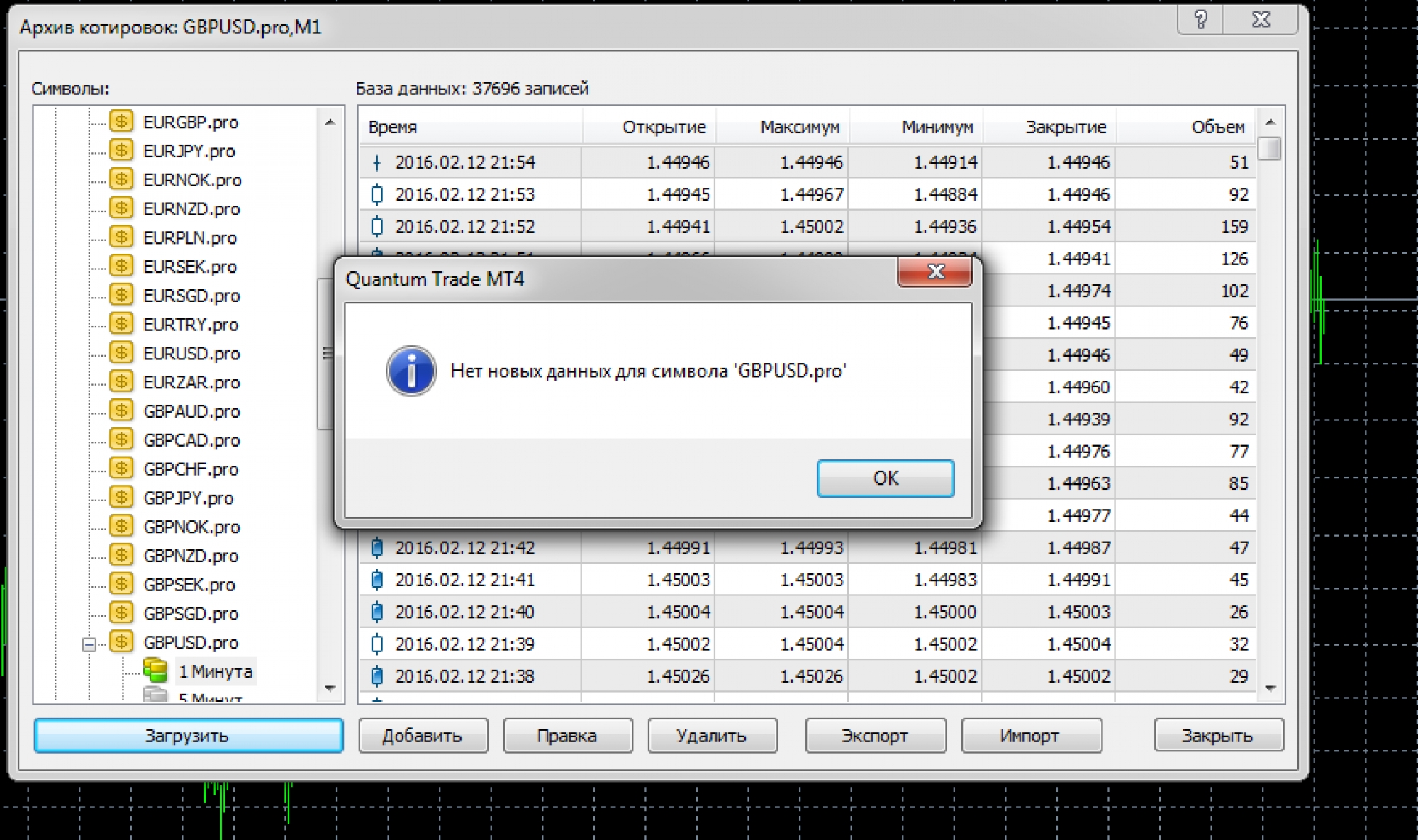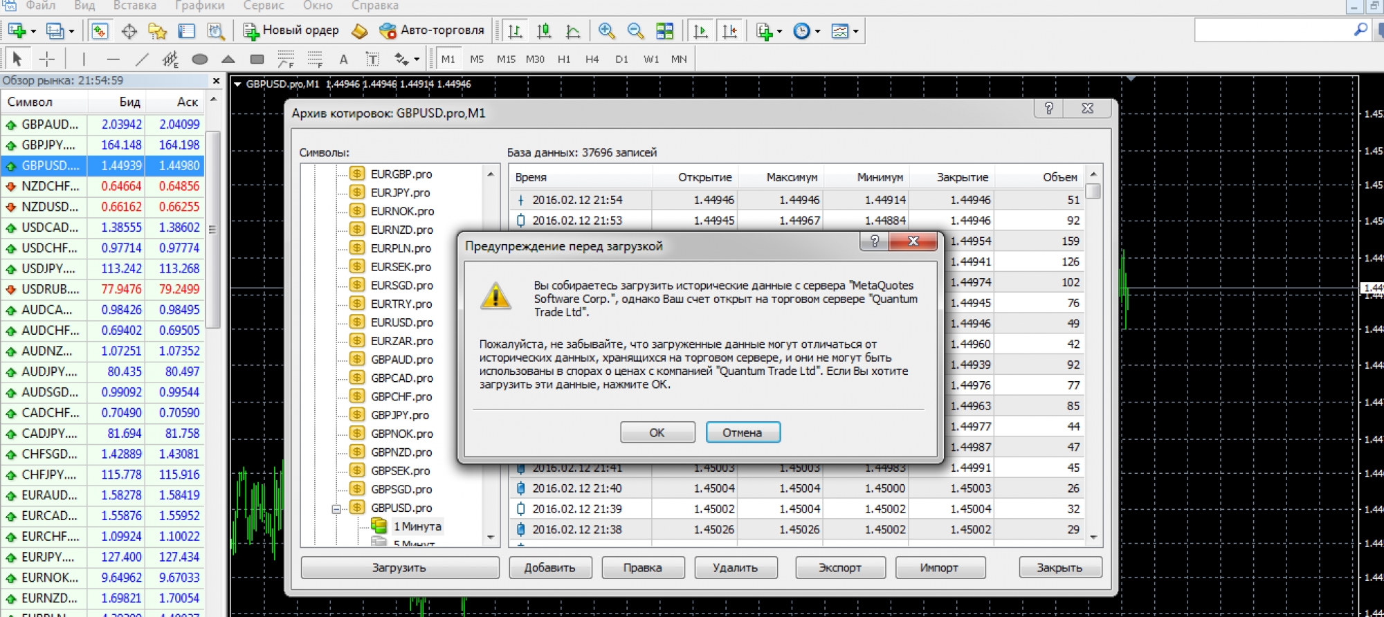 Решила обновить архив котировок по рекомендации выше, но при обновлении в процессе загрузки 1 минутного интервала выходит окно с предупреждением: «вы собираетесь загрузить исторические данные с сервера «МеtaQuotes Software Corp», однако Ваш счёт (демо-счёт) открыт на открытом сервере «Admiral Markets ltd«. Пожалуйста, не забывайте, что загруженные данные могут отличаться от исторических данных, хранящихся на торговом сервере, и они не могут быть использованы в спорах о ценах с компанией «Admiral Markets Ltd».