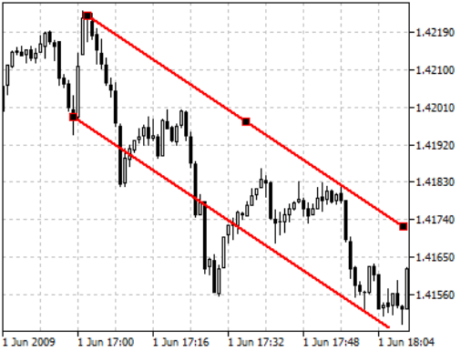 Чтобы выполнить эффективный графический анализ, трейдер должен уметь выполнять управление каналами. Если перетащить среднюю точку главной линии – канал переместится полностью, не меняя своих размеров. Различные манипуляции с последней точкой позволяют менять длину, направление канала. Если перемещать точки на главной линии канала, можно перемещать данную границу, вне зависимости от другой.