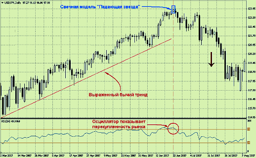 Сама по себе «Падающая звезда» не считается сильным единичным сигналом на разворот, поэтому она должна подкрепляться другими сигналами (наличие в месте появления модели сильного уровня сопротивления, выход осциллятора из зоны перекупленности).