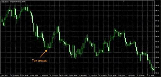 Свечная модель «Три звезды» представляет собой три свечи типа доджи, которые располагаются рядом. Разрыв между первой свечой и предыдущими не обязателен, а средний доджи должен иметь разрыв вниз или вверх. Как правило, все три дожди располагаются на одном уровне. Данная модель является сигналом к развороту.