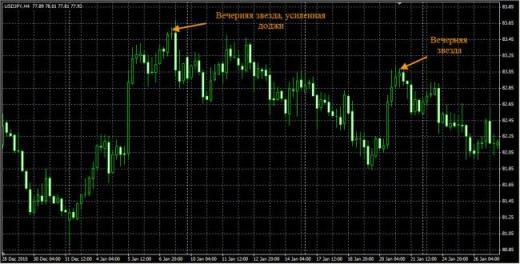 Принцип отработки модели «Вечерняя звезда» сравнительно простой. На имеющемся бычьем импульсе появляется очередная сильная (большое тело, умеренные тени) бычья свеча, а за ней идет свеча с коротким телом, что говорит про ослабление существующей тенденции. Если данная свеча имеет длинную верхнюю тень (либо обе тени), вес предупреждения увеличивается, так как говорит про неопределенность на рынке.