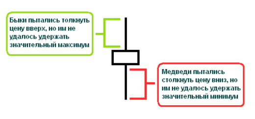 Анализируя японские подсвечники, трейдер должен знать, что небольшой размер тела (заполненного или пустого) свечи свидетельствует про то, что разница цены открытия и цена закрытия совсем минимальная, а тени говорят, что на протяжении сессии и медведи, и быки наступали, но никто из них победы одержать не смог.