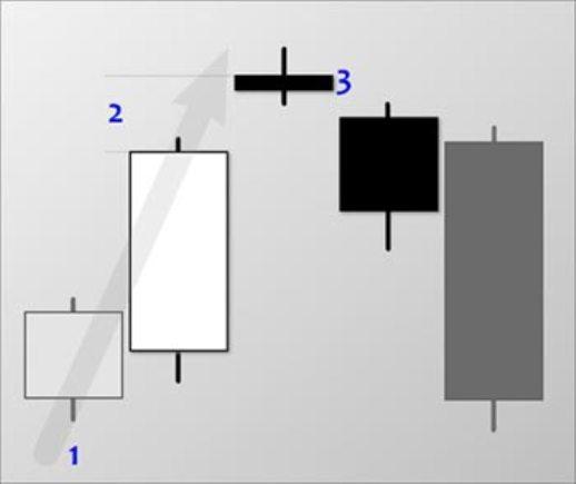 - Если тренд восходящий, появляются 3 свечи, возвышающиеся друг за другом и не закрывающие собой рядом стоящие фигуры. Если тренд нисходящий, все происходит в зеркальном варианте.