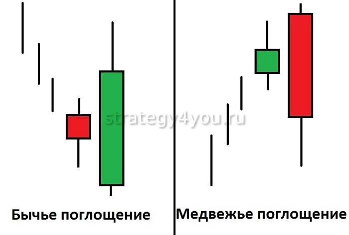 - модель открывается с промежутком цен и затем своей точкой закрытия поглощает более 50% предыдущей фигуры.