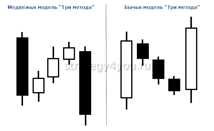 У этой модели существует вариация, имеющая название «Три метода». Ее появление говорит о том, что на бирже была небольшая коррекция и существующий тренд не исчез, а продолжает действовать.