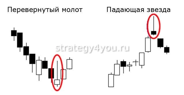 Это «Перевернутый молот» и «Падающая звезда». Так как они являются слабыми моделями, для работы с ними необходимы индикатор свечных паттернов или другие способы рыночного анализа. На бирже использовать не рекомендуют.