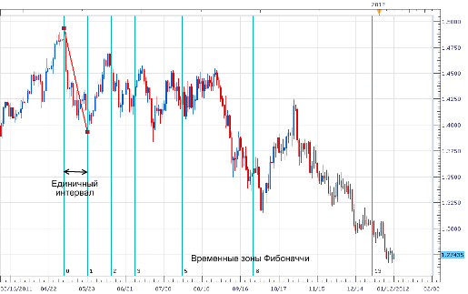 Начальная и конечная точка отмечаются на экстремумах стоимости (минимум-минимум, минимум-максимум, максимум-максимум, максимум-минимум). На основании построенного единичного отрезка по числам Фибоначчи автоматически на график накладываются остальные вертикальные линии. По мере продолжения последовательности чисел расстояние между линиями увеличивается. Значительные изменения стоимости можно ожидать или на самих линиях, или возле них.