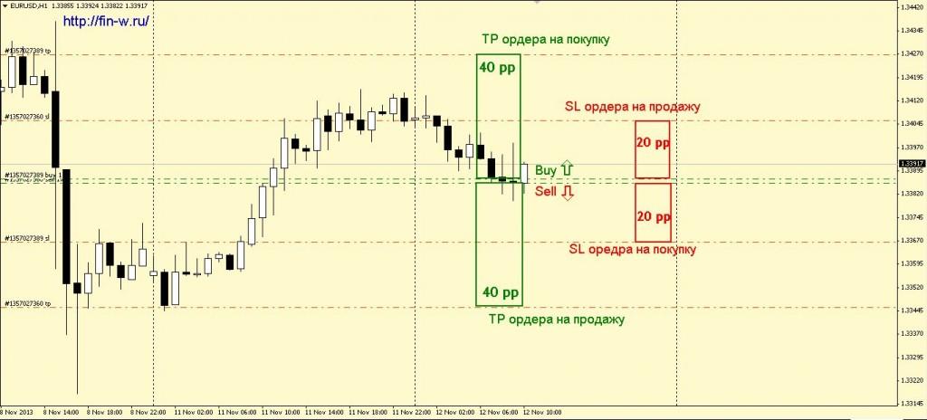 1) Один ордер закроется по стопу, а противоположный ему ордер достигнет профита. – Конечно шанс пройти 20 пунктов больше, чем пройти 40 пунктов, но как только срабатывает стоп-лосс, до профита противоположного ордера останется все те же 20 пп., а до его же стоп-лосса уже 40 пп. То есть мы в этом случае примерно уравняли шансы, но так как уже один ордер будет закрыт с минусом, мы, не вдаваясь более подробно в математические вычисления, определили наши шансы на успех примерно как 40% против 60% на неудачу.