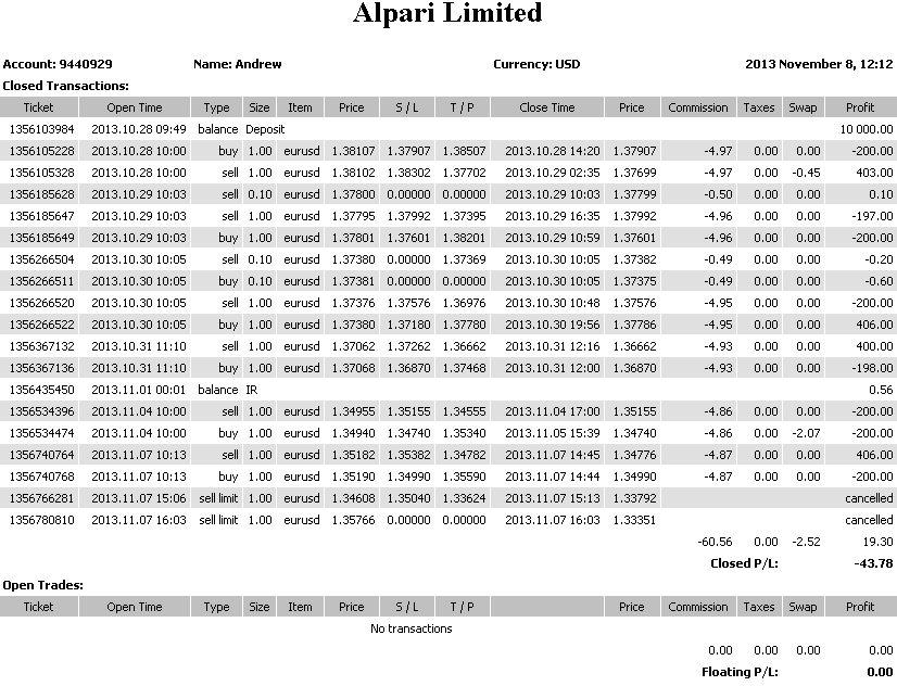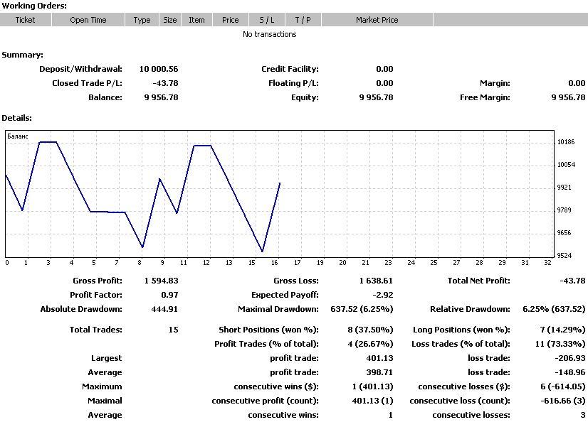 Ниже представлен отчет о торговле (небольшой итоговый минус обусловлен типом счета ECN, где за каждую сделку взималась комиссия. Если ее не брать в расчет, то в итоге получился даже небольшой плюс):